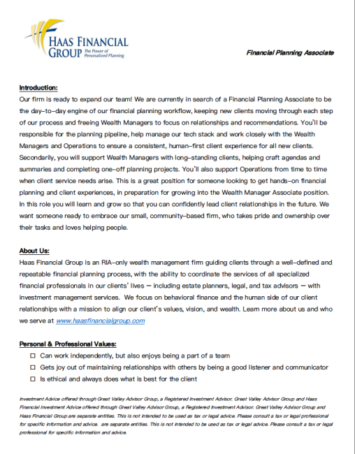 Our firm is ready to expand our team! We are currently in search of a Wealth Manager Associate to help in financial plan development for new clients and to take the lead on servicing several long-standing client relationships. As a growing financial advisory business, we are looking for a seasoned candidate ready to jump into this role with both feet! If you think this job could be for you, please send an email to info@haasfinancialgroup.com with your resume and a short video introducing yourself, describing what makes you the best we can hire and why you would like to join our team. We want someone ready to embrace our small, community-based firm, who takes pride and ownership over their tasks and loves helping people.