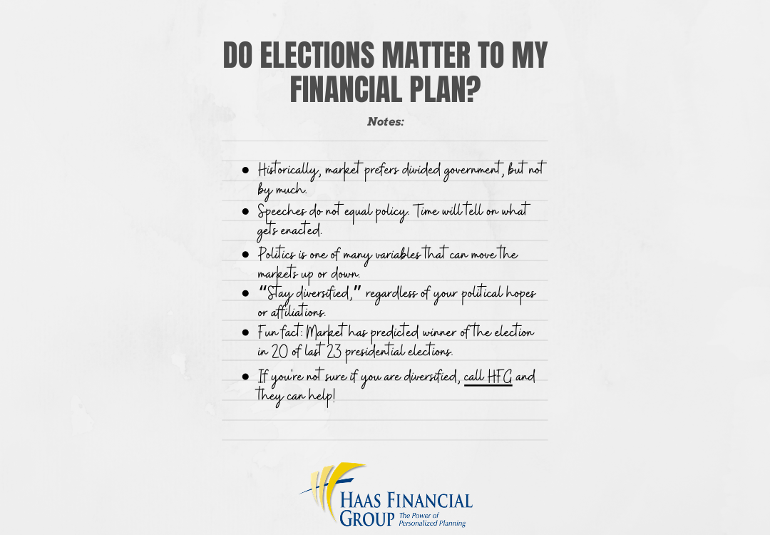 Listen in on our conversation, focused on the impact that the election could have to your financial plan. This is not a political conversation. We will share historical facts, resources and tips to financially navigate through the election and beyond. And, if you're not sure if you are diversified, call Haas Financial Group!