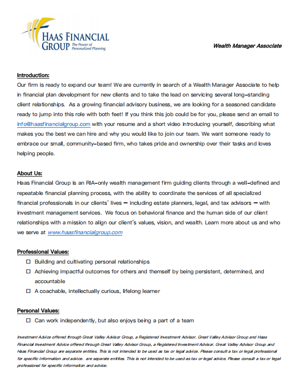 Our firm is ready to expand our team! We are currently in search of a Wealth Manager Associate to help in financial plan development for new clients and to take the lead on servicing several long-standing client relationships.  As a growing financial advisory business, we are looking for a seasoned candidate ready to jump into this role with both feet! If you think this job could be for you, please send an email to info@haasfinancialgroup.com with your resume and a short video introducing yourself, describing what makes you the best we can hire and why you would like to join our team. We want someone ready to embrace our small, community-based firm, who takes pride and ownership over their tasks and loves helping people.
